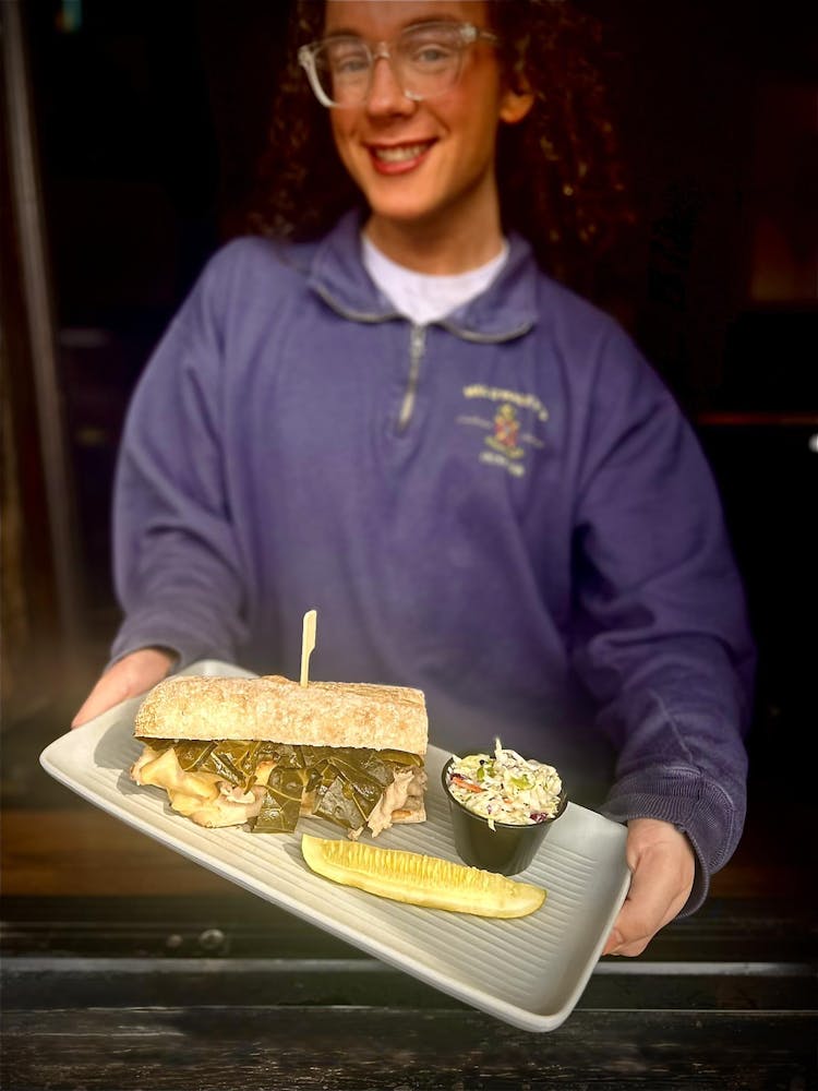 Thinly sliced hot and juicy corned beef, Swiss, whole grain mustard, and pickles pressed and grilled on fresh rolls.